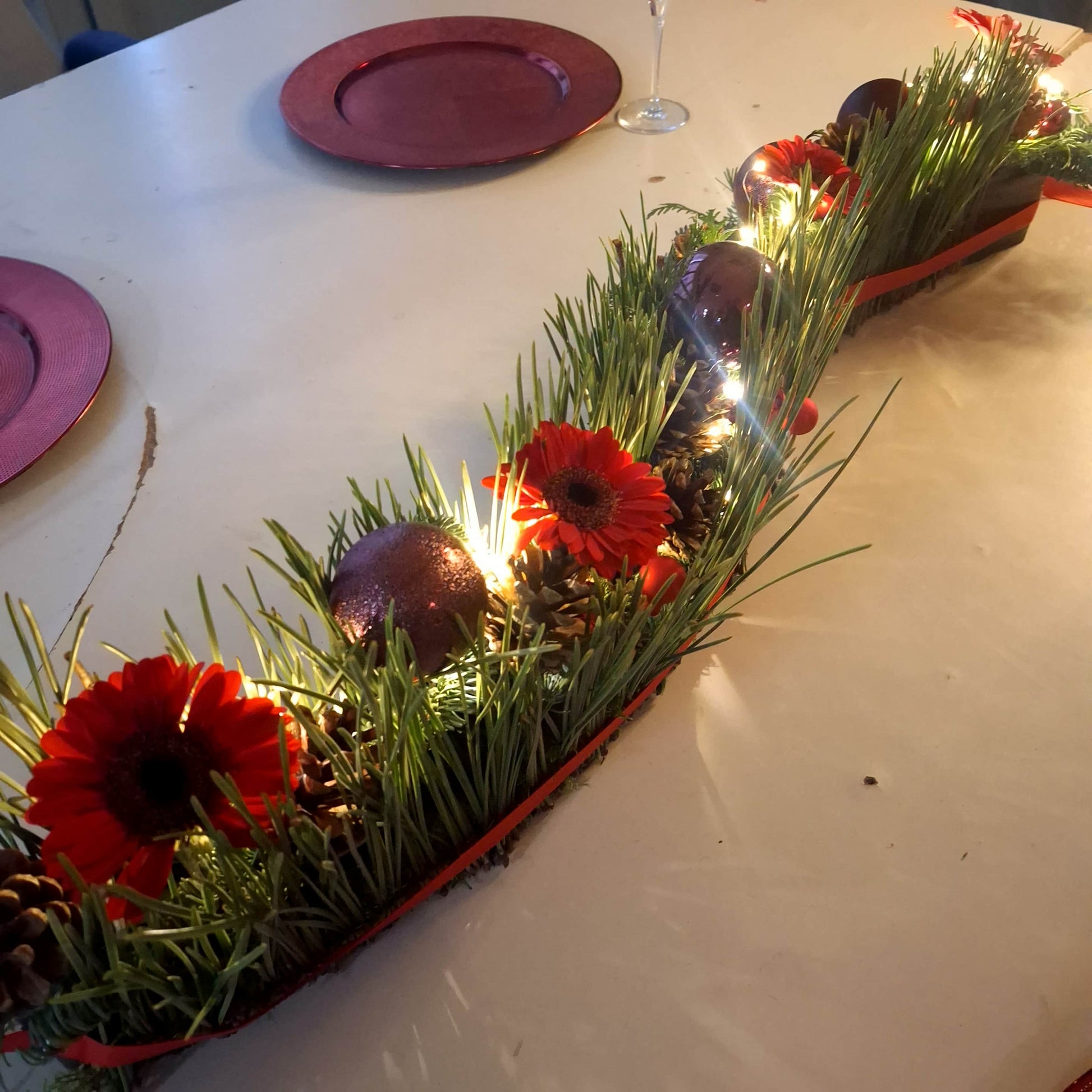 met 4 bloembuisjes met bloemen en blijvend groen materiaal en kerstdecoratie
